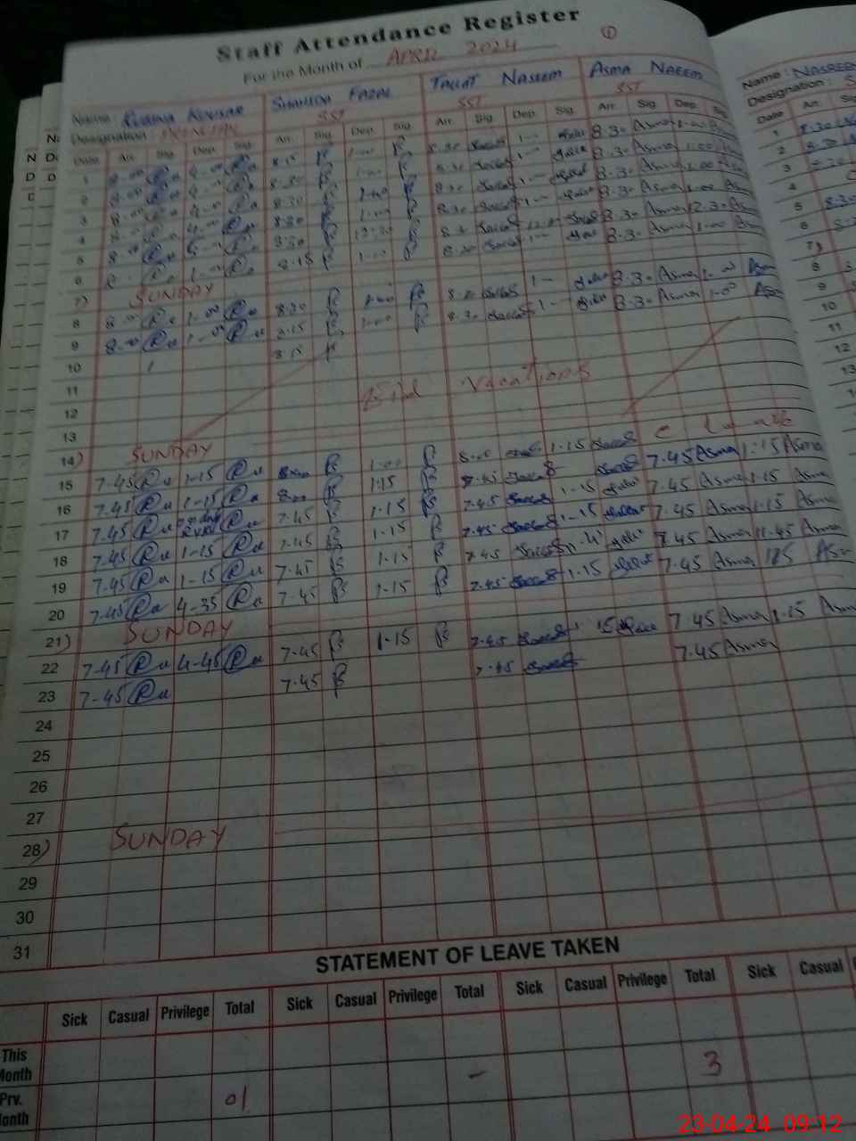 | Leave | Duty | Absent | Maternity | Medical | Ex- Pak |