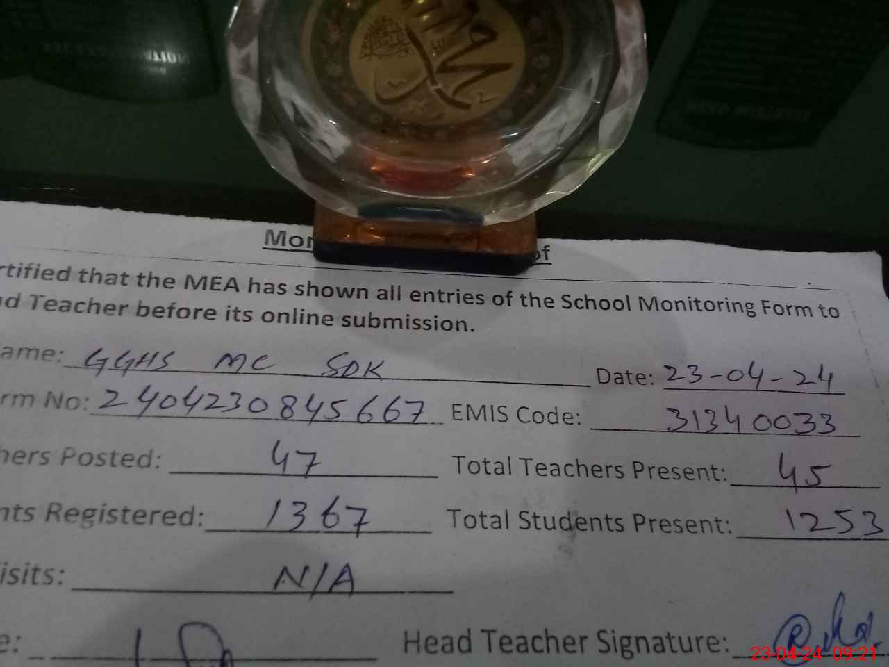 | Attendance Register | Head Teacher | MEA with School | Visit Proof |