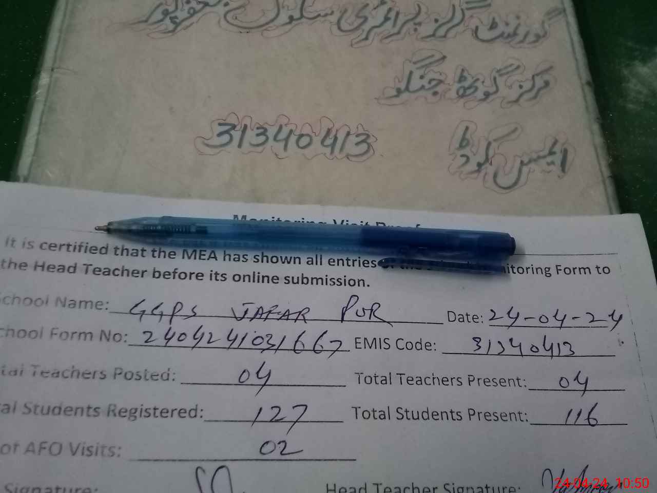 | Attendance Register | Head Teacher | MEA with School | Visit Proof |
