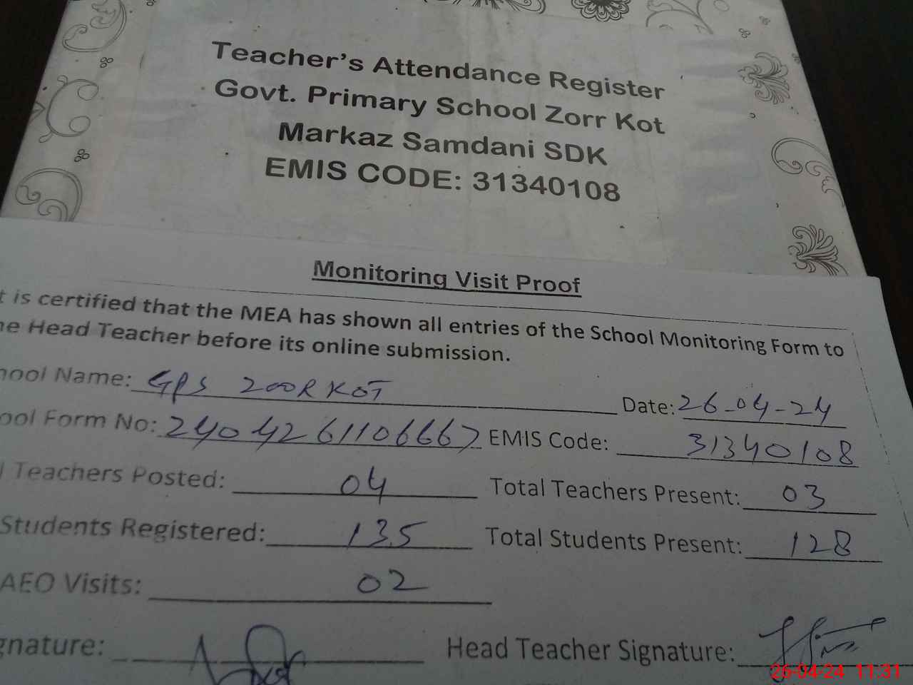 | Attendance Register | Head Teacher | MEA with School | Visit Proof |