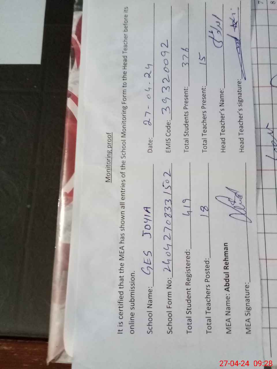 | Name: Im**** Al**** Designation: (School Headmaster's/Headmistress's) SST Phone/Cell Number: 03**** |