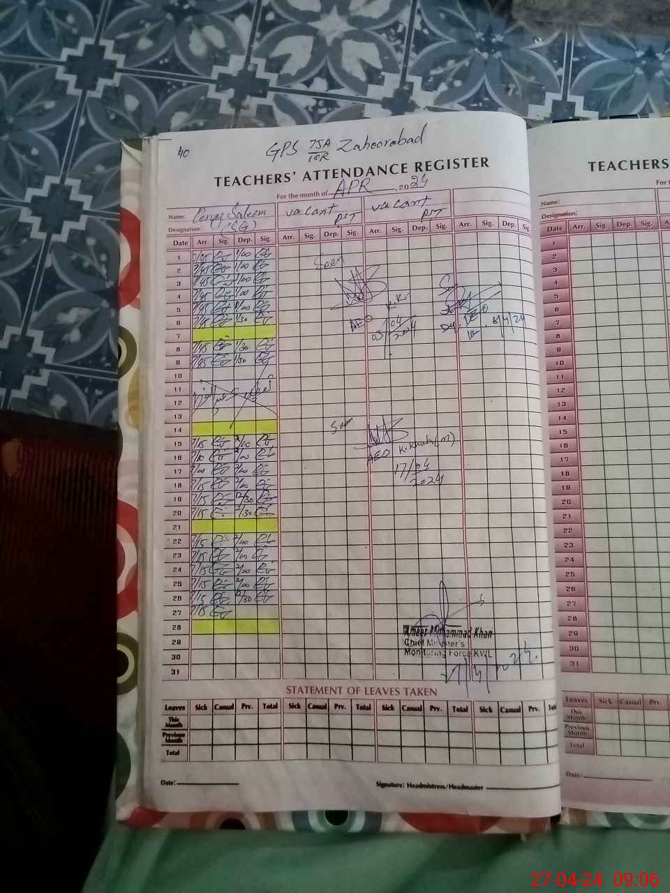 | Name: AM**** AL**** Designation: (School Headmaster's/Headmistress's) PST Phone/Cell Number: 03**** |