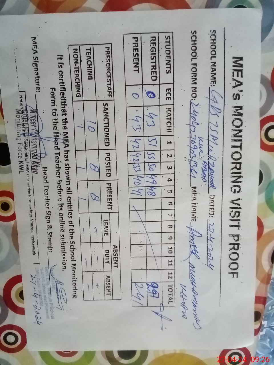 | Attendance Register | Head Teacher | MEA with School | Visit Proof |