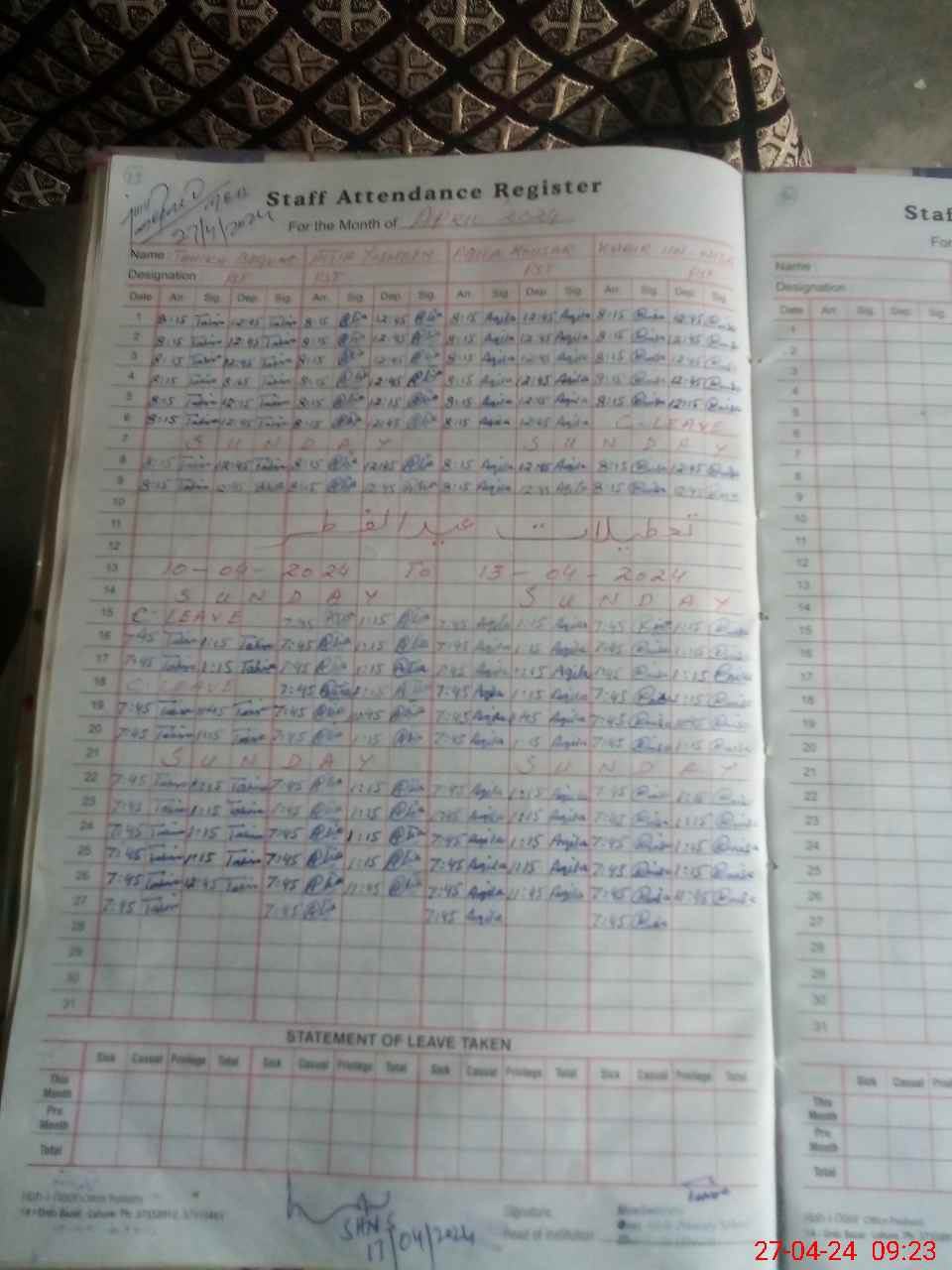 | Leave | Duty | Absent | Maternity | Medical | Ex- Pak |