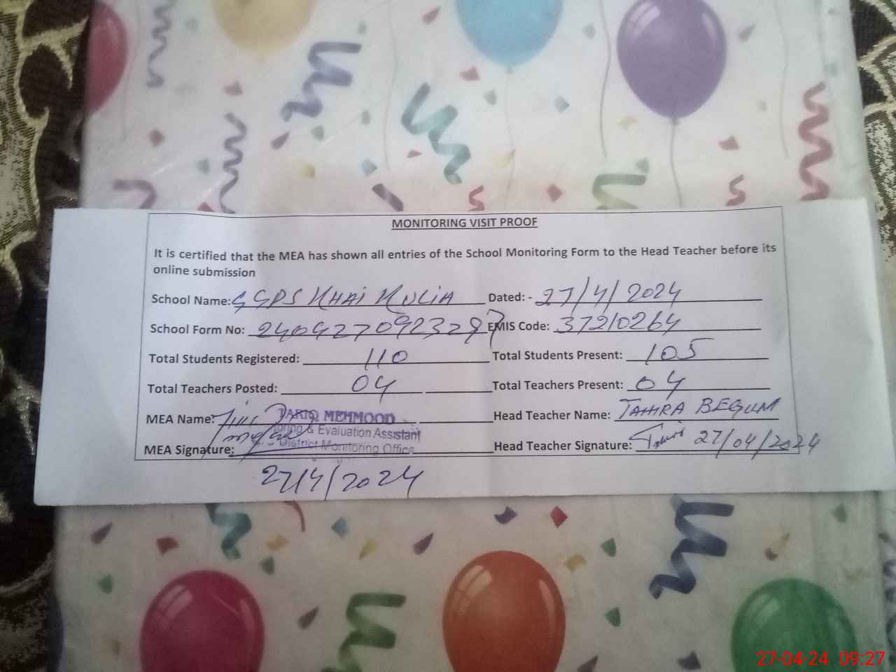 | Attendance Register | Head Teacher | MEA with School | Visit Proof |