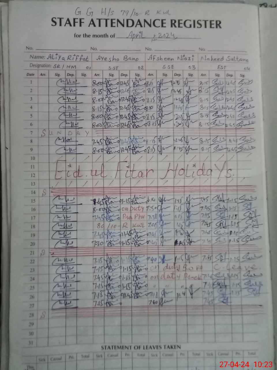 | Leave | Duty | Absent | Maternity | Medical | Ex- Pak |