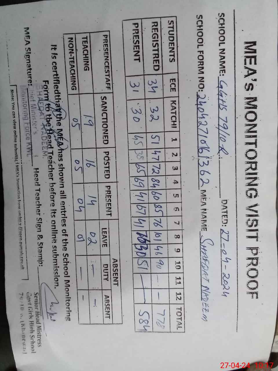 | Attendance Register | Head Teacher | MEA with School | Visit Proof |