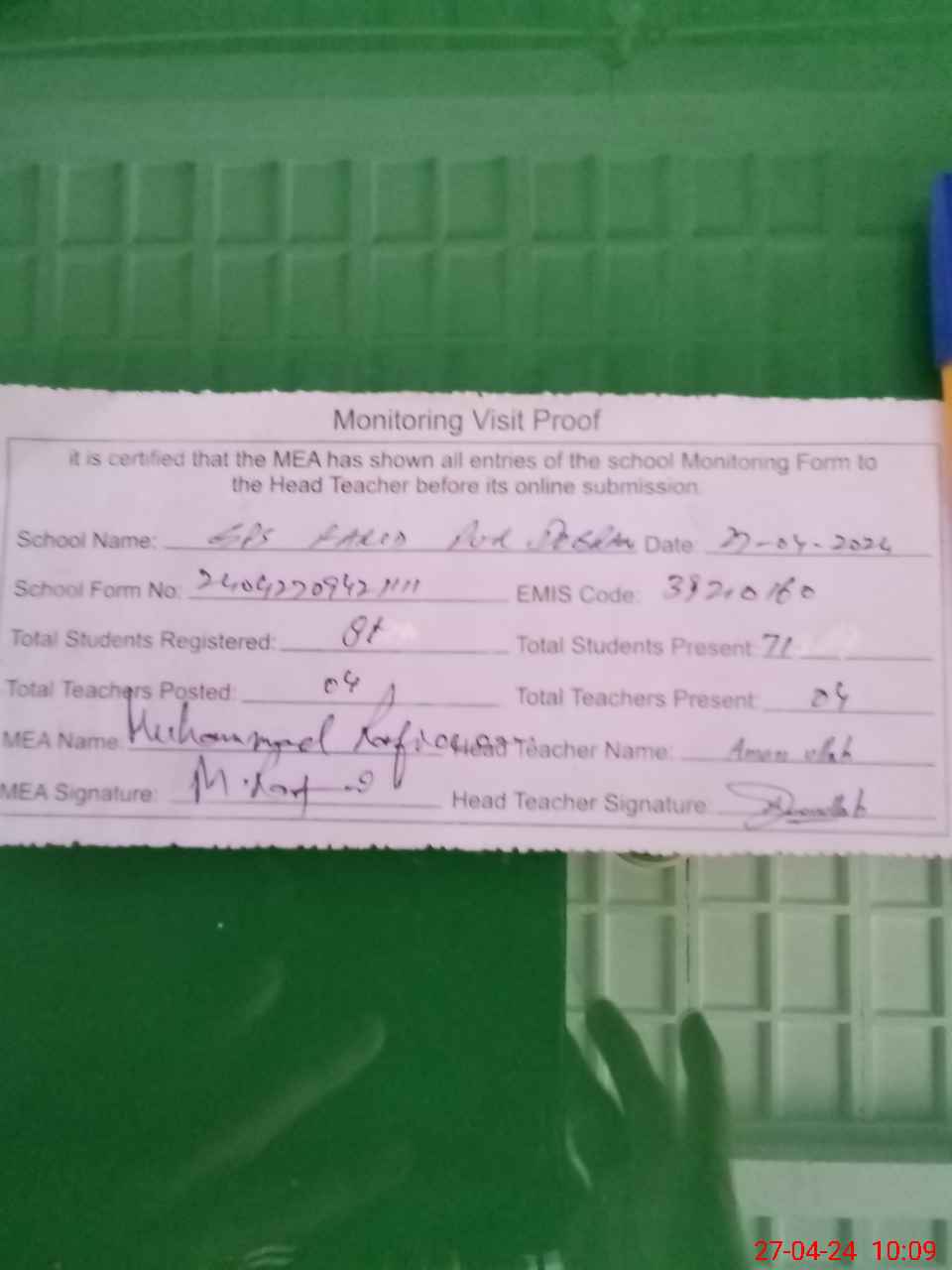 | Attendance Register | Head Teacher | MEA with School | Visit Proof |