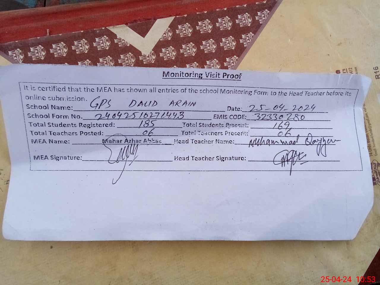 | Attendance Register | Head Teacher | MEA with School | Visit Proof |