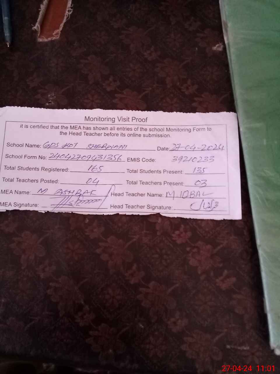 | Attendance Register | Head Teacher | MEA with School | Visit Proof |