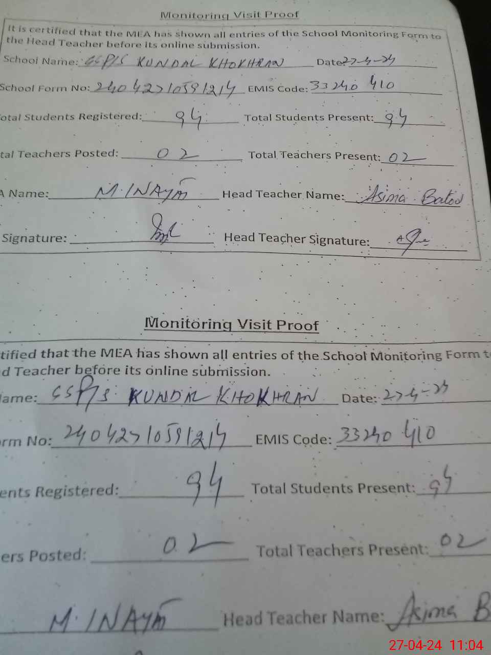 | Attendance Register | Head Teacher | MEA with School | Visit Proof |