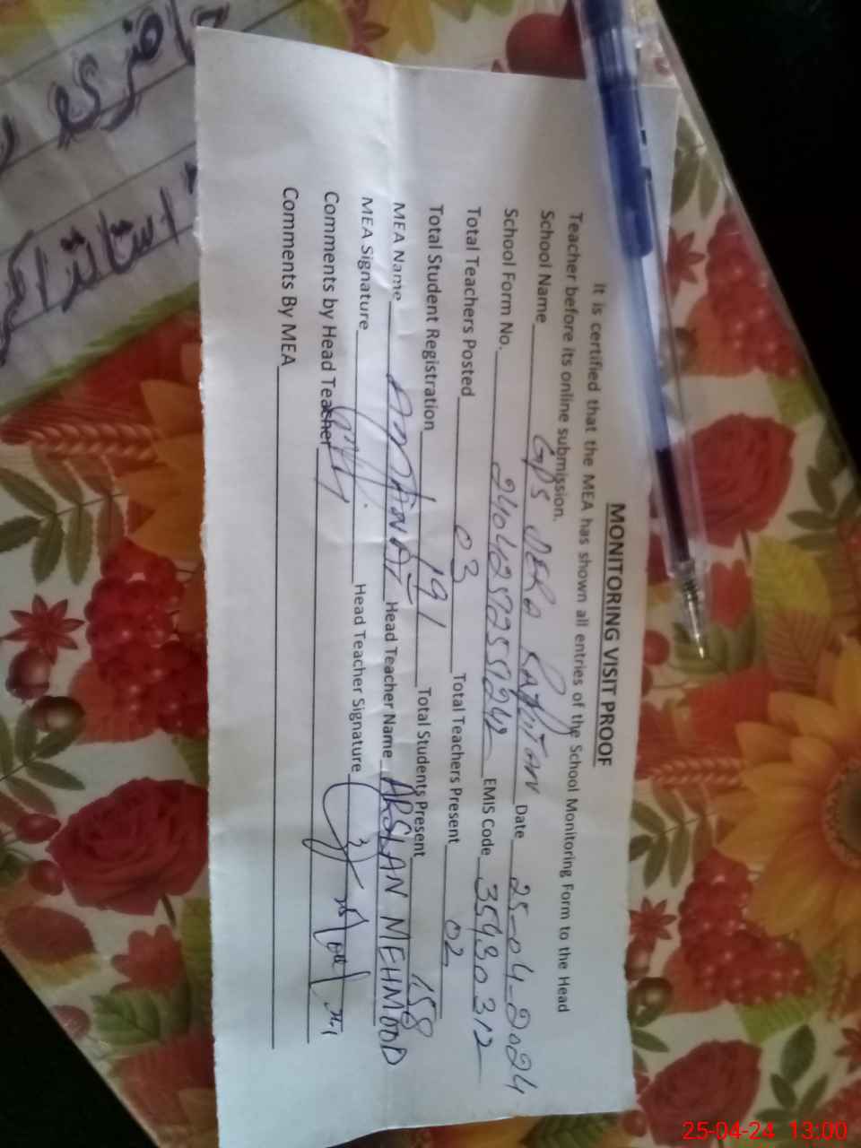 | Name: Ar**** Me**** Designation: (School Headmaster's/Headmistress's) PST Phone/Cell Number: 03**** |