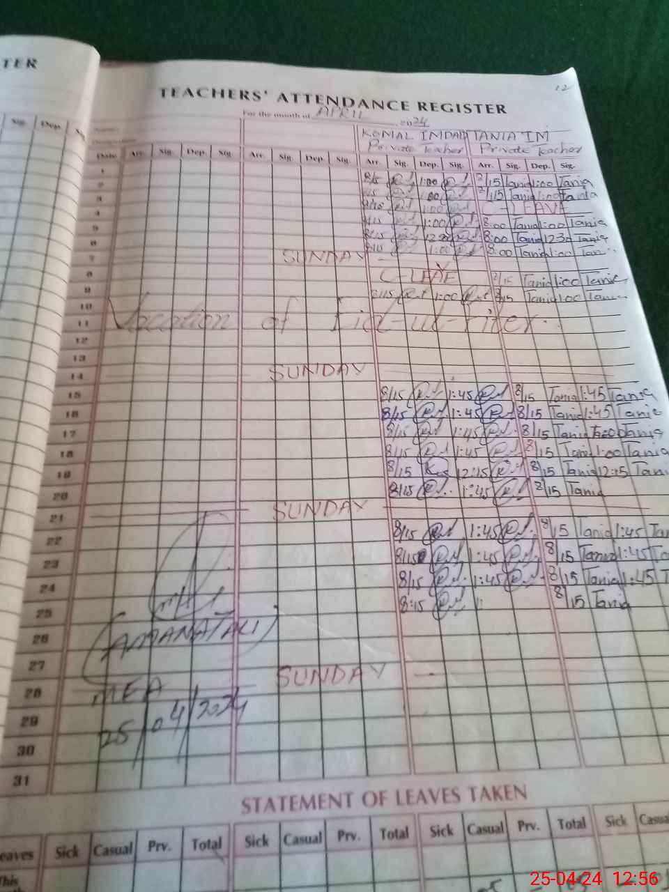 | Leave | Duty | Absent | Maternity | Medical | Ex- Pak |