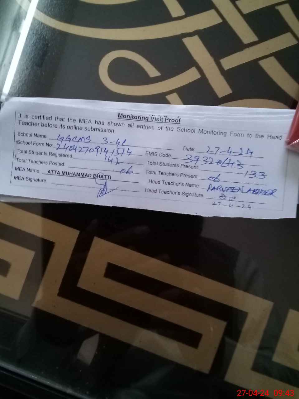 | Attendance Register | Head Teacher | MEA with School | Visit Proof |