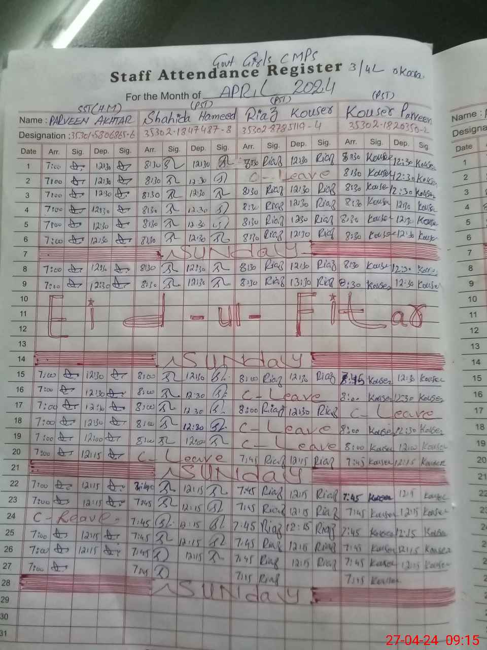 | CNIC | Full Name | Designation | R/C | Absence During Last Calender Month |