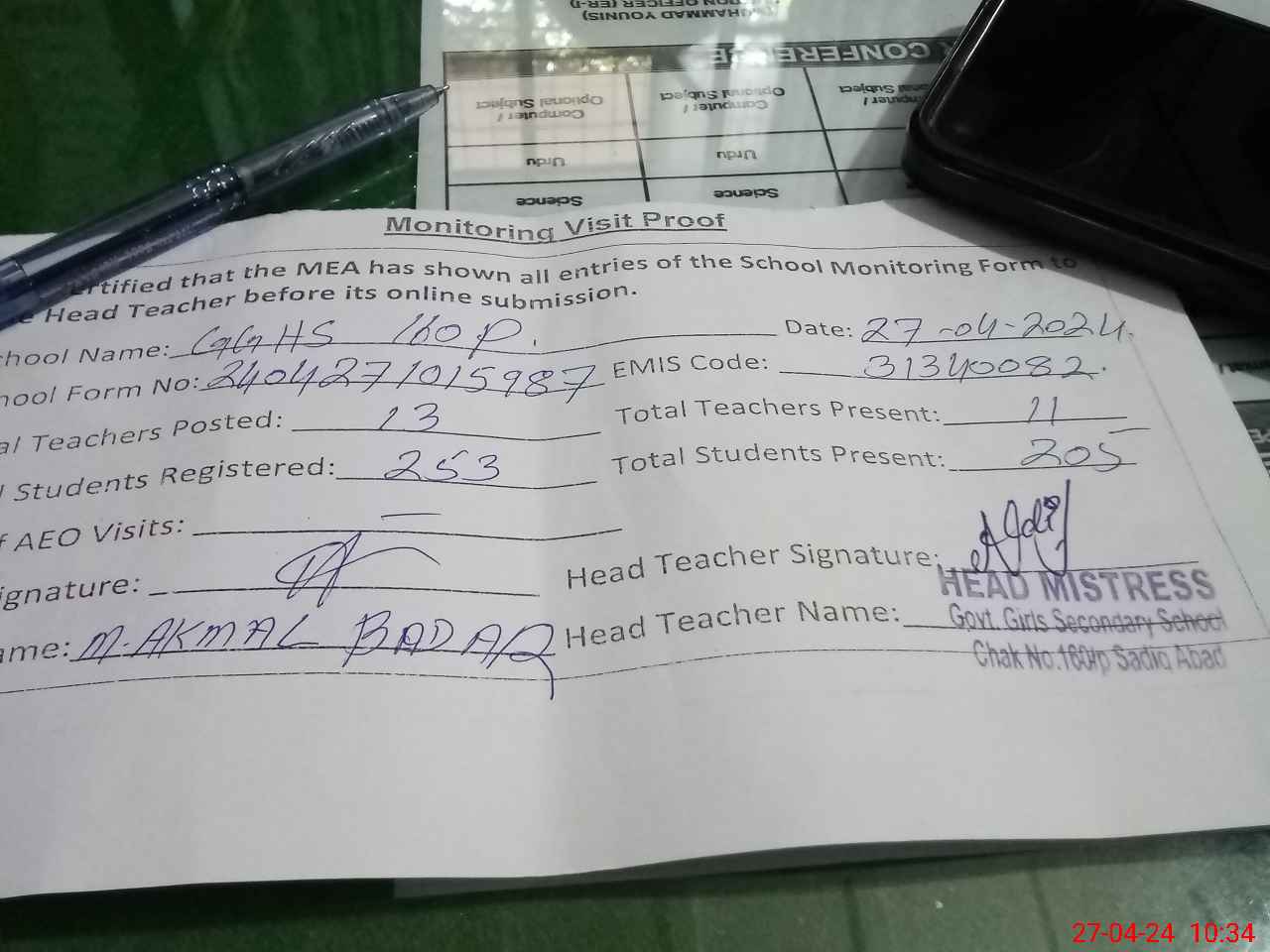 | Attendance Register | Head Teacher | MEA with School | Visit Proof |