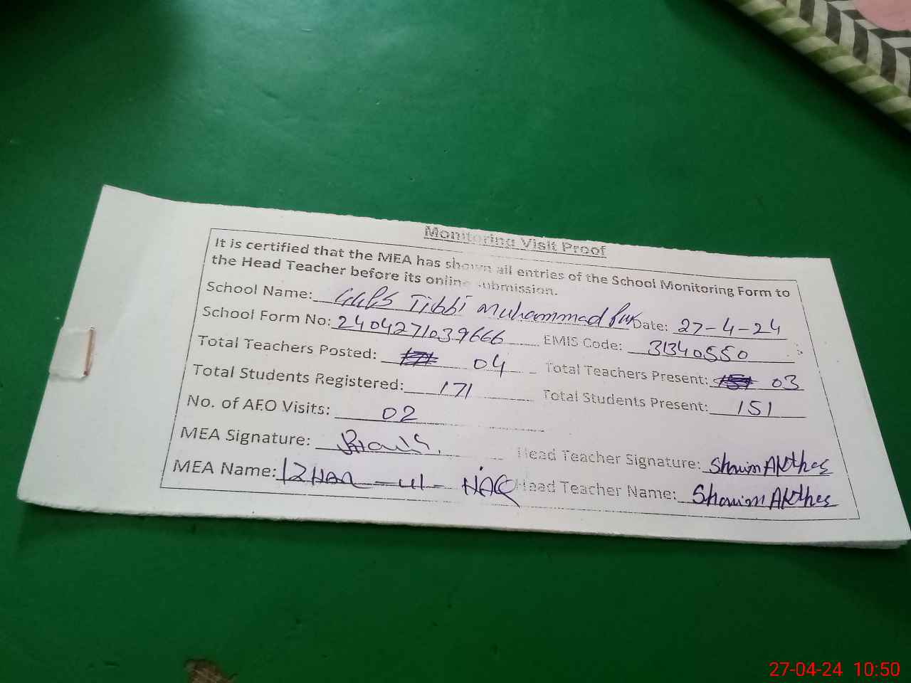| Attendance Register | Head Teacher | MEA with School | Visit Proof |