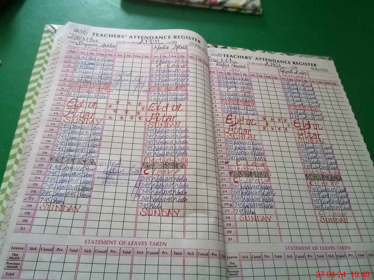 | Leave | Duty | Absent | Maternity | Medical | Ex- Pak |