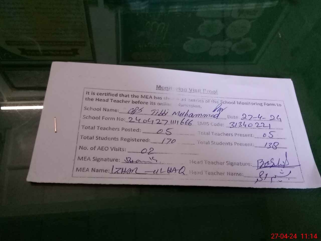 | Attendance Register | Head Teacher | MEA with School | Visit Proof |