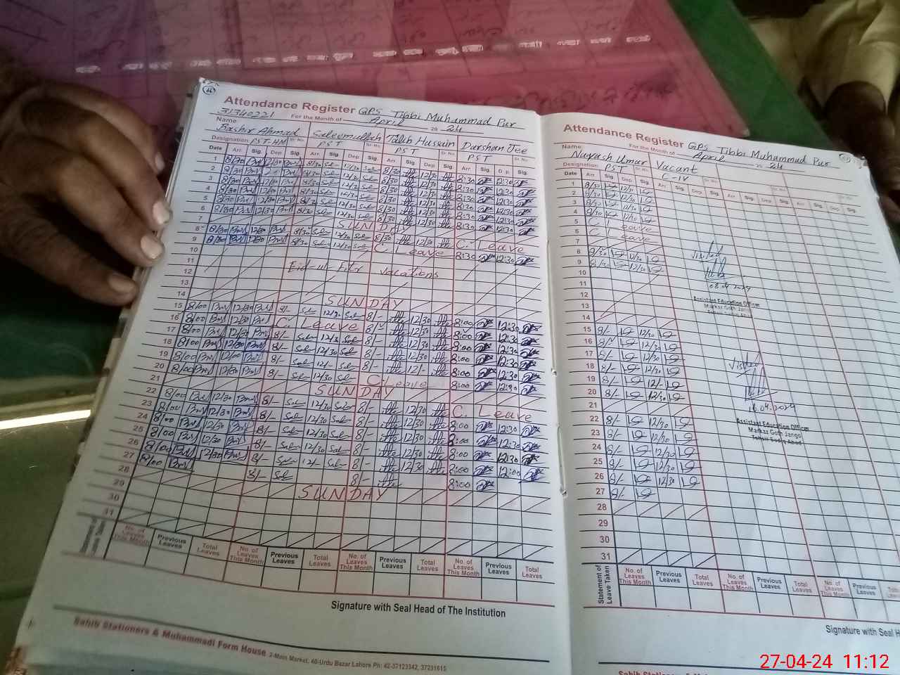 | CNIC | Full Name | Designation | R/C | Absence During Last Calender Month |