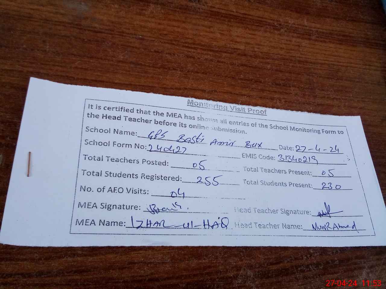 | EMIS Code: 31340219 | Name of School: GPS BASTI AMIR BUX | |||