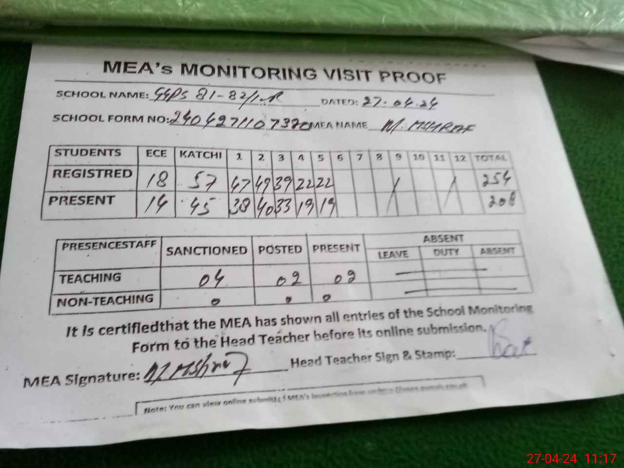 | Attendance Register | Head Teacher | MEA with School | Visit Proof |