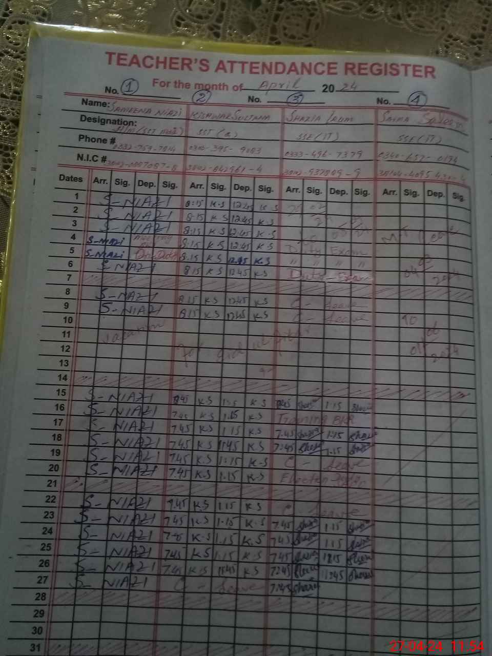 | CNIC | Full Name | Designation | R/C | Absence During Last Calender Month |