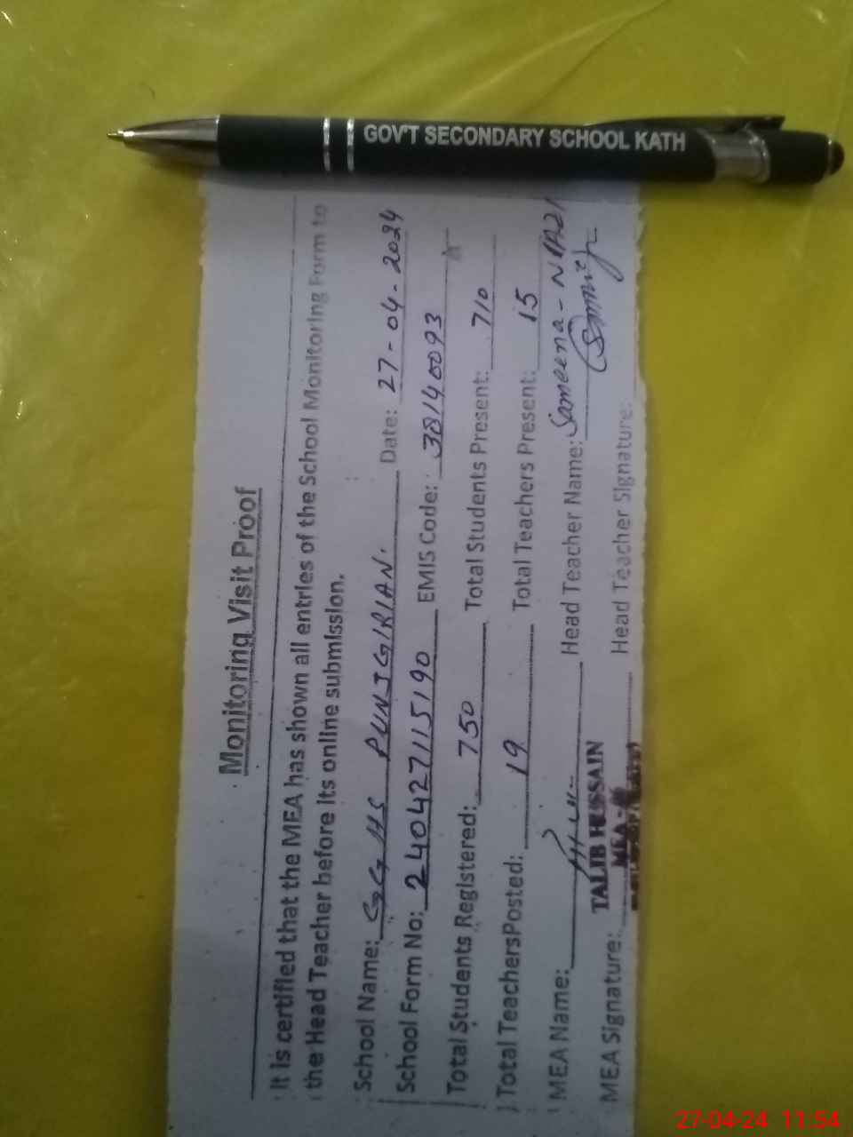 | Attendance Register | Head Teacher | MEA with School | Visit Proof |