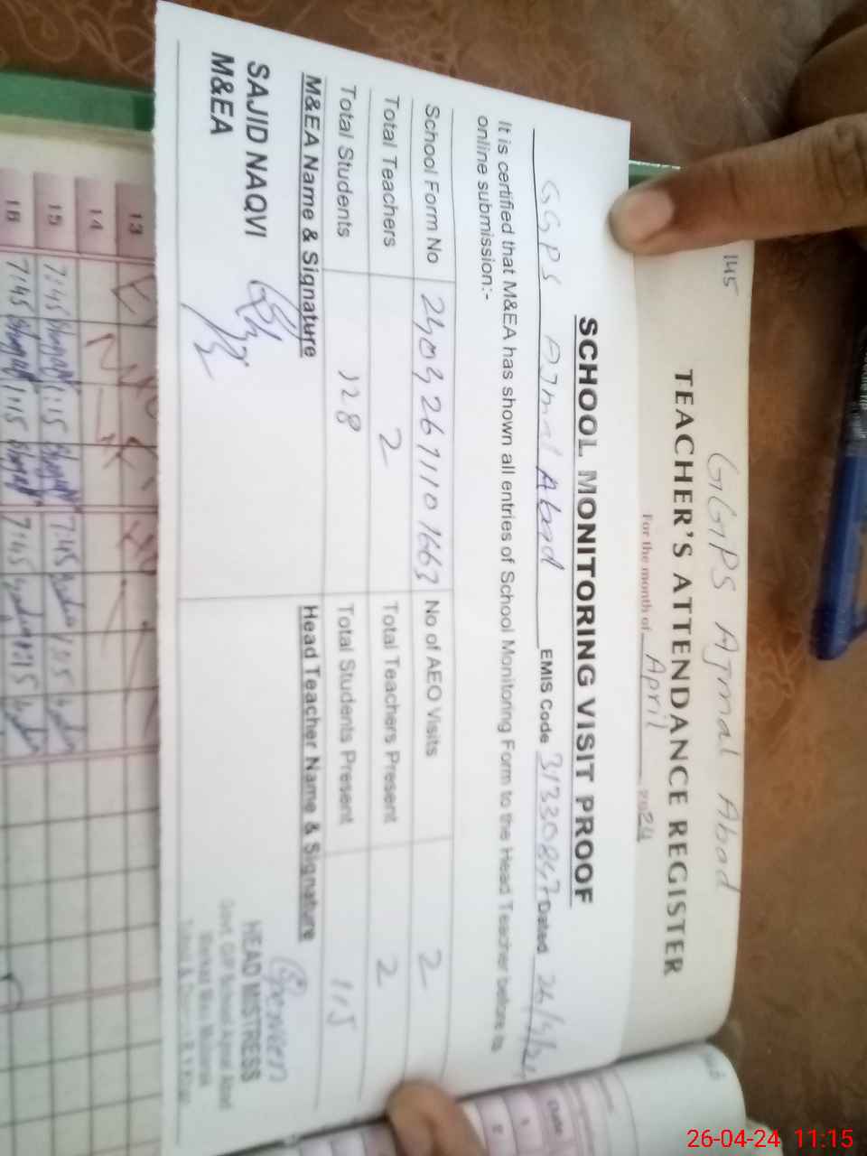 | Attendance Register | Head Teacher | MEA with School | Visit Proof |