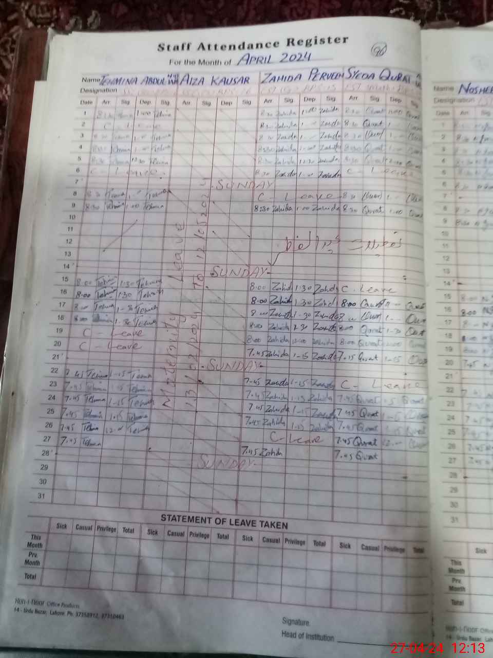 | CNIC | Full Name | Designation | R/C | Absence During Last Calender Month |