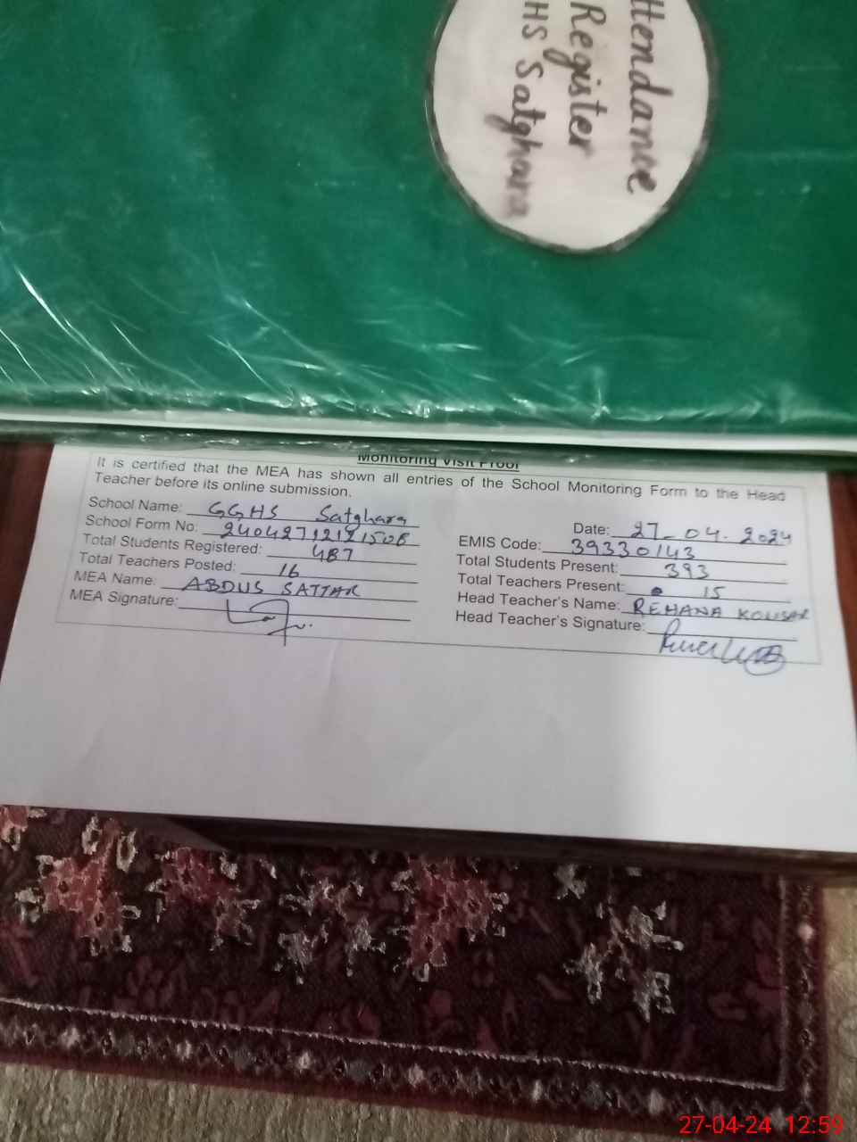 | Attendance Register | Head Teacher | MEA with School | Visit Proof |