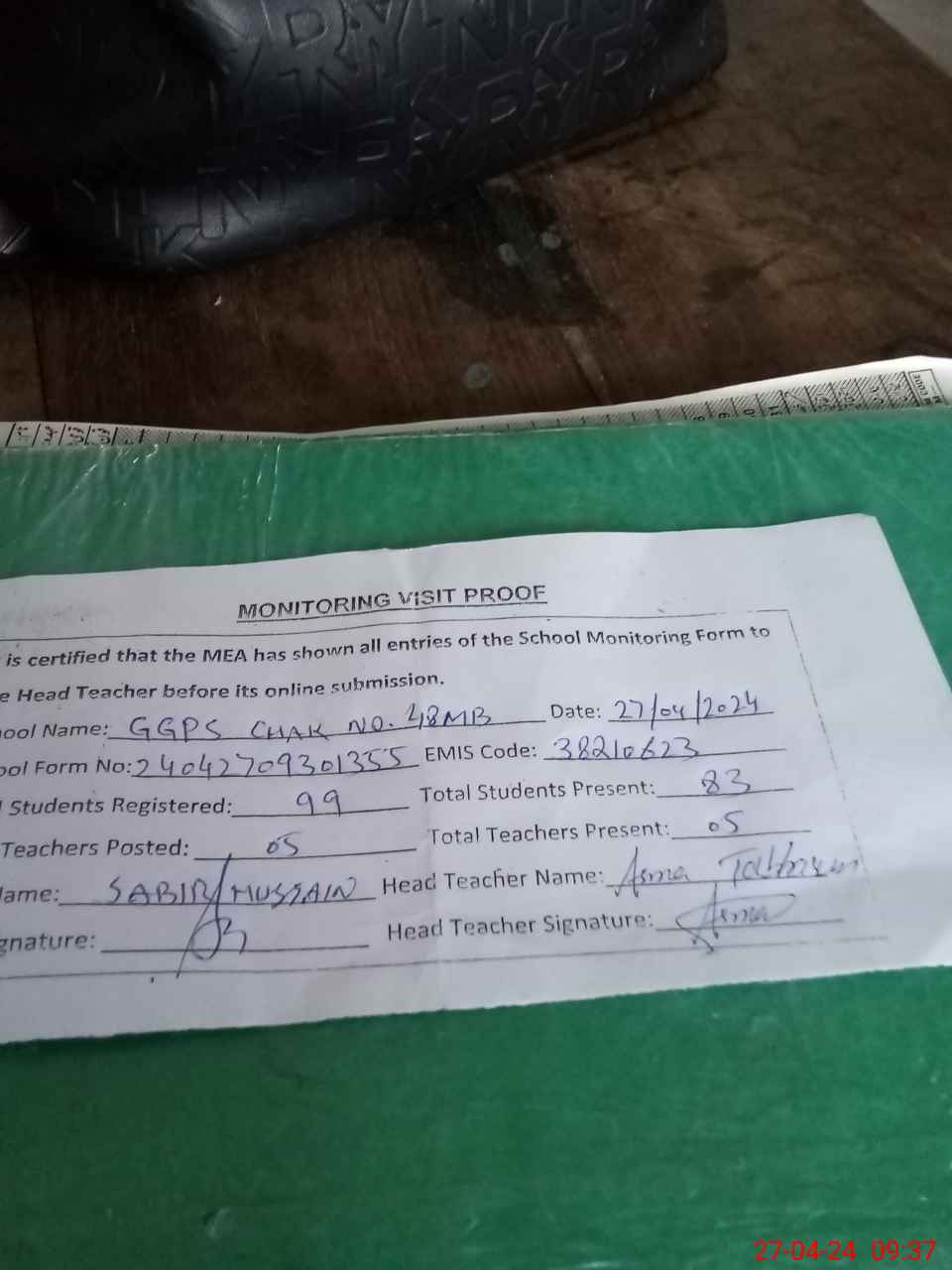 | Attendance Register | Head Teacher | MEA with School | Visit Proof |