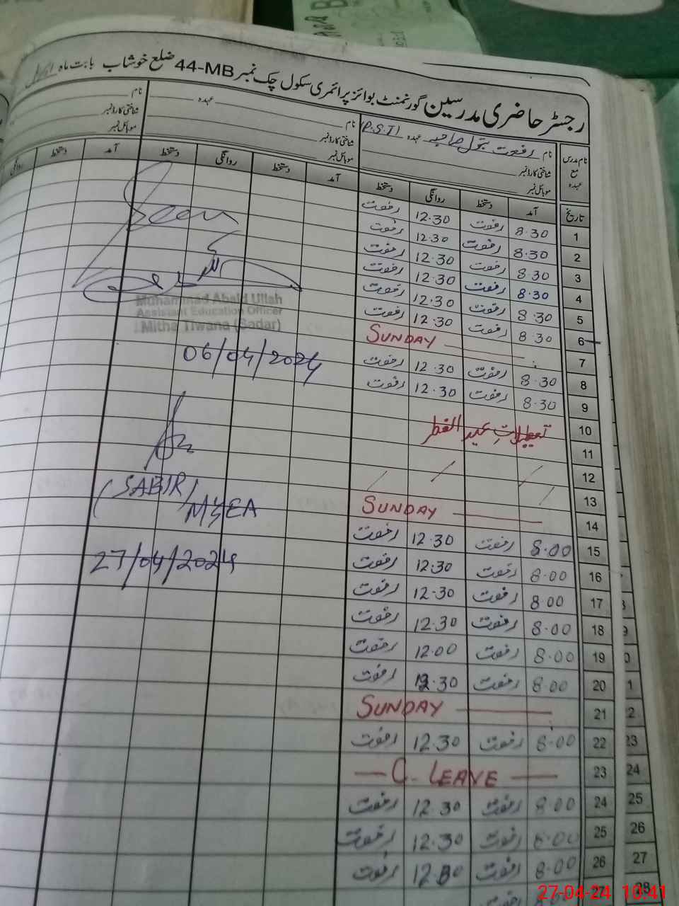 | Name: MU**** AQ**** Designation: (School Headmaster's/Headmistress's) PST Phone/Cell Number: 03**** |