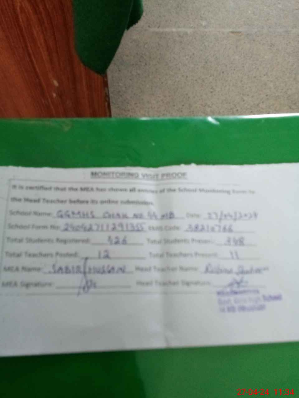 | Attendance Register | Head Teacher | MEA with School | Visit Proof |