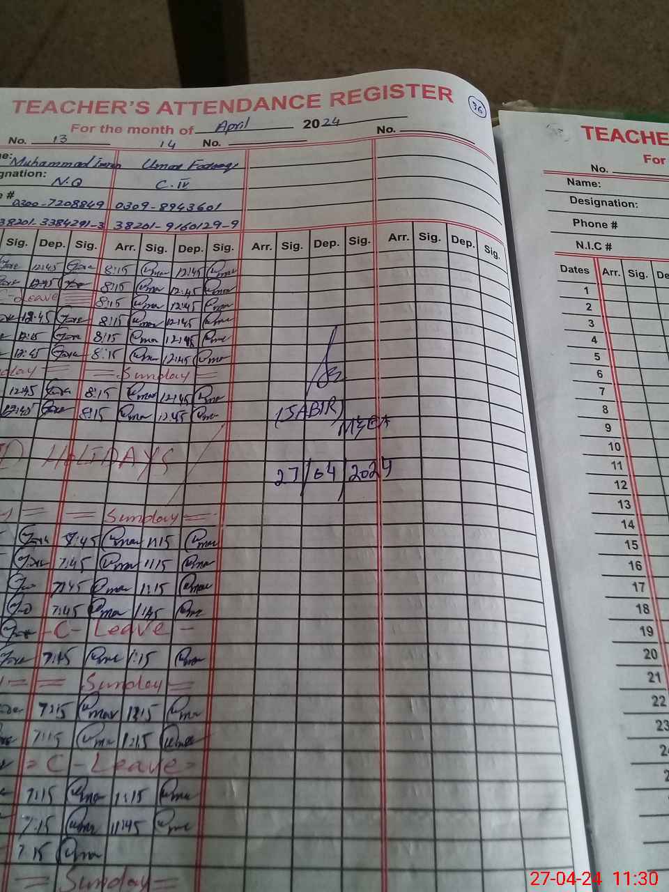 | CNIC | Full Name | Designation | R/C | Absence During Last Calender Month |