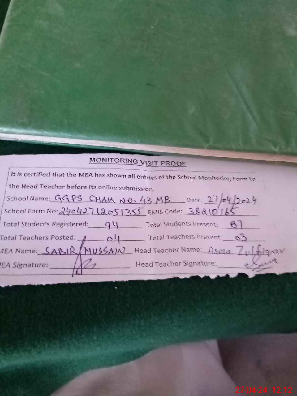 | EMIS Code: 38210765 | Name of School: GGPS CHAK NO 43 MB | |||