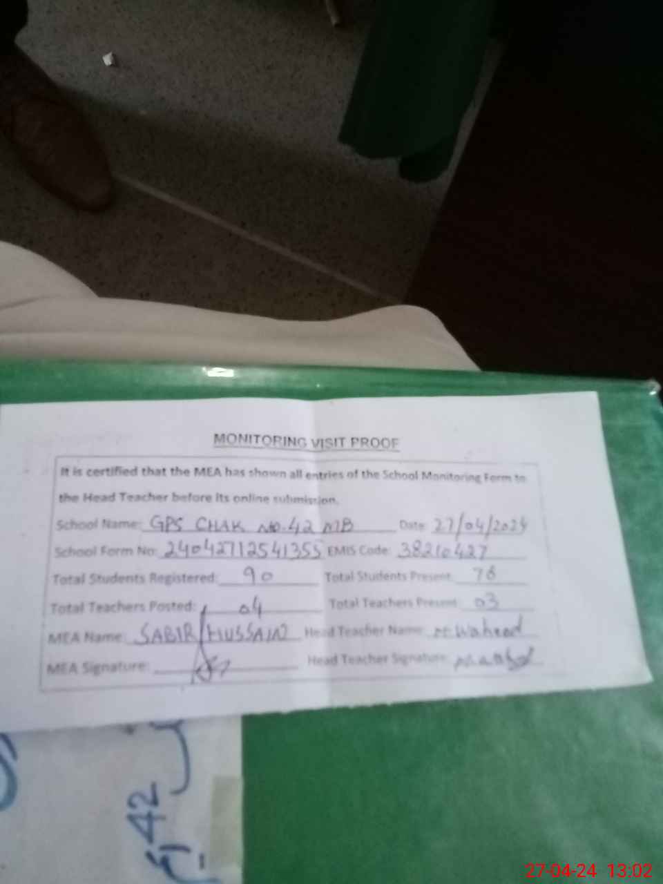 | EMIS Code: 38210427 | Name of School: GPS CHAK NO. 42 MB | |||