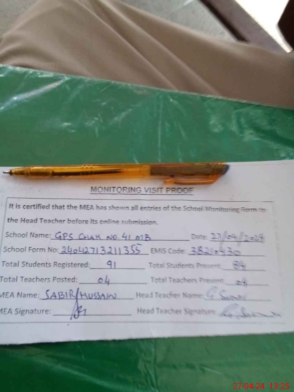 | Attendance Register | Head Teacher | MEA with School | Visit Proof |