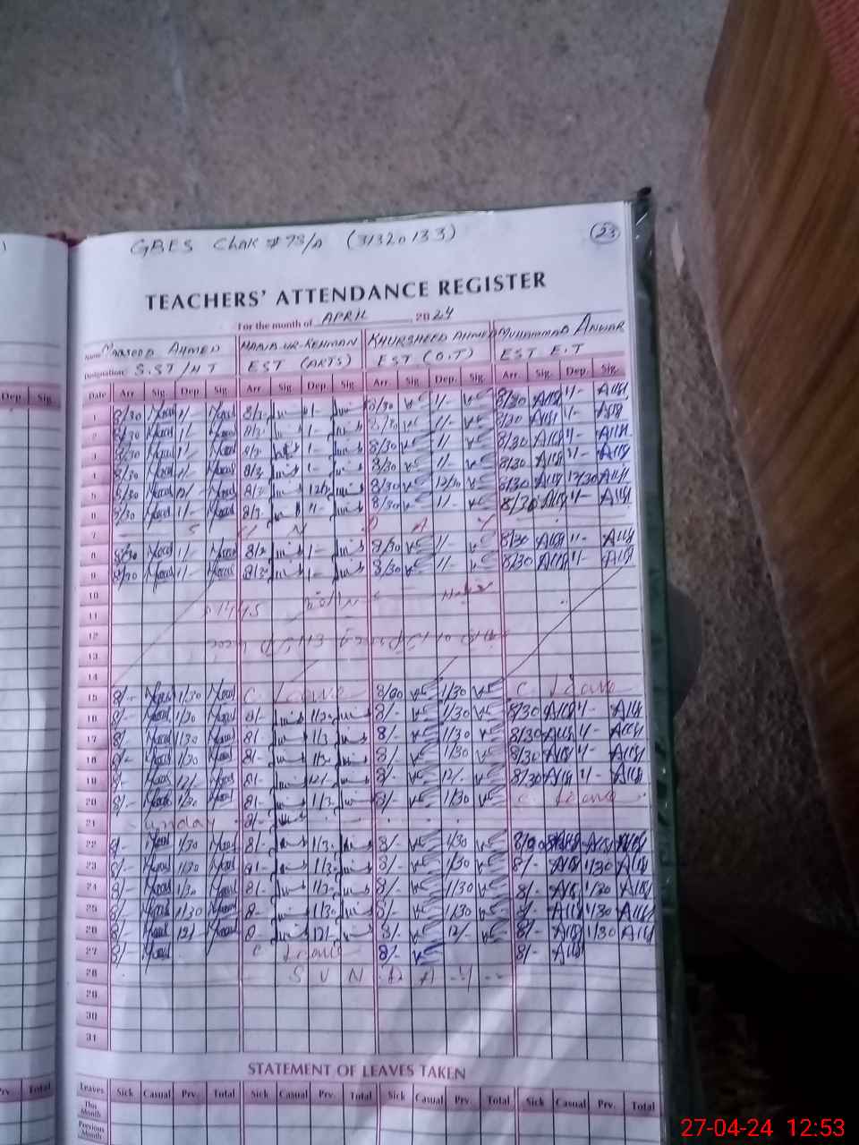 | Monitoring Date: 27-04-2024 | Start Time: 27-04-2024 12:30 PM | End Time: 27-04-2024 12:58 PM | Name of MEA: Mu**** Sa**** Ul**** Sa**** | |