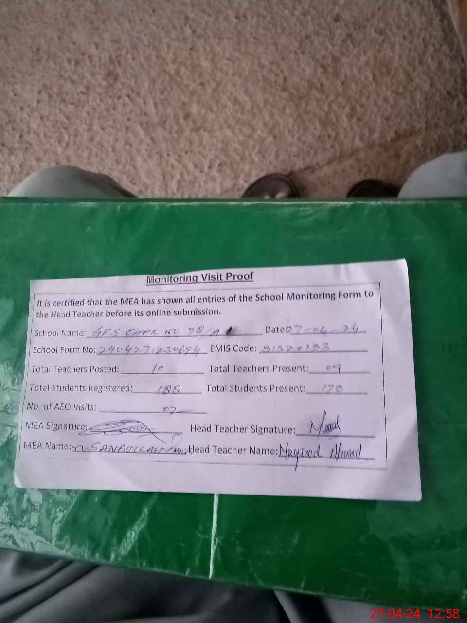 | Attendance Register | Head Teacher | MEA with School | Visit Proof |