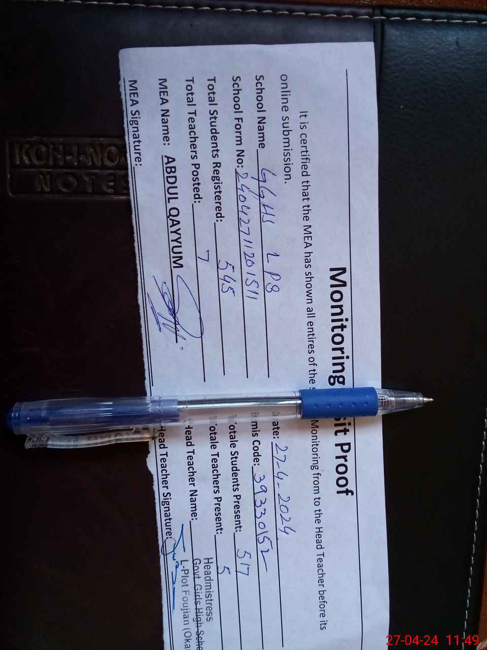 | Attendance Register | Head Teacher | MEA with School | Visit Proof |