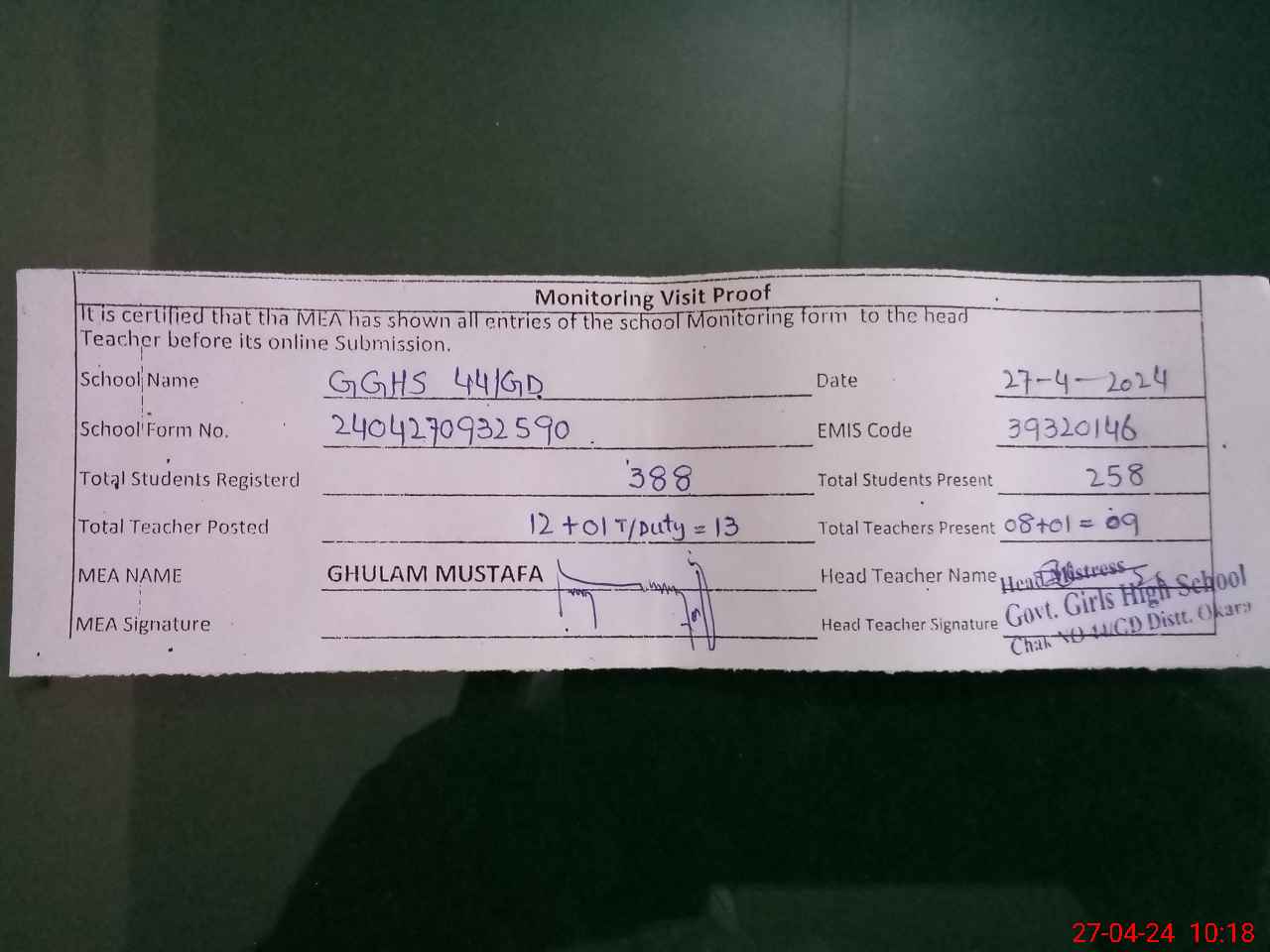 | Attendance Register | Head Teacher | MEA with School | Visit Proof |