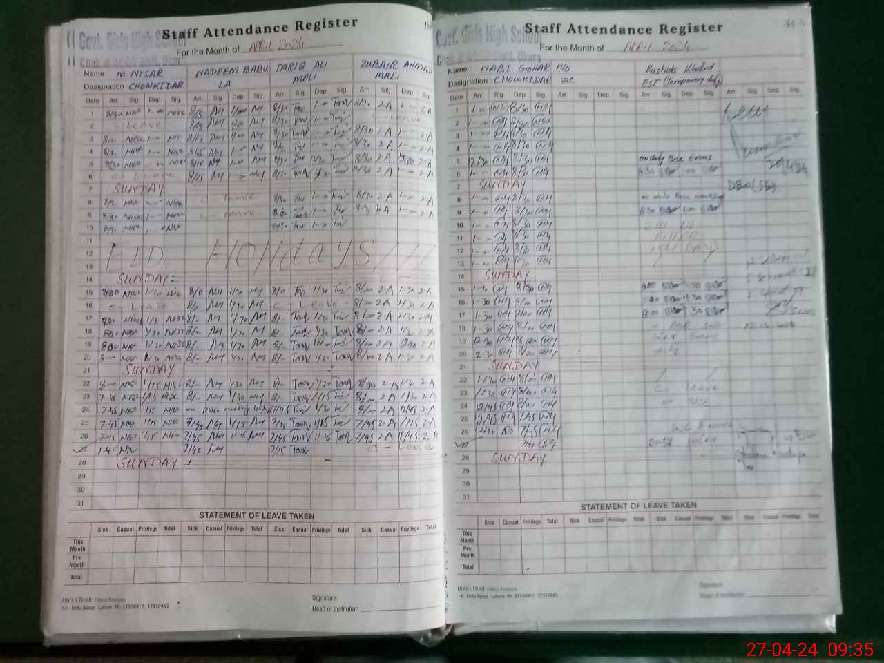 | 36**** | Ta**** Sa**** | 3 | 1 | 0 | 0 | 0 | 0 | 0 | 0 | 0 | 0 | 0 | Exam Duty |