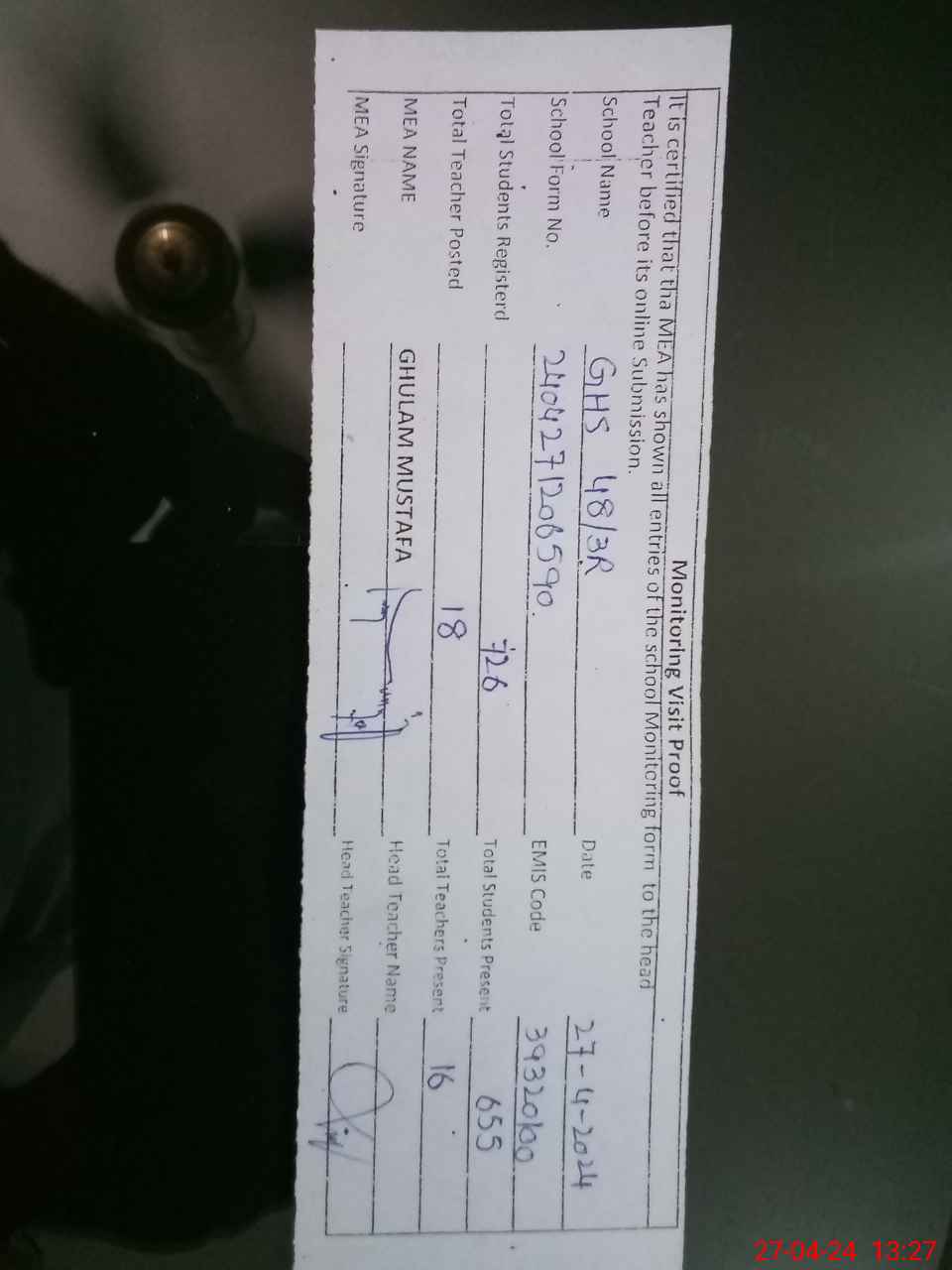| Name: Sh**** Al**** Designation: (School Headmaster's/Headmistress's) HEADMASTER Phone/Cell Number: 03**** |