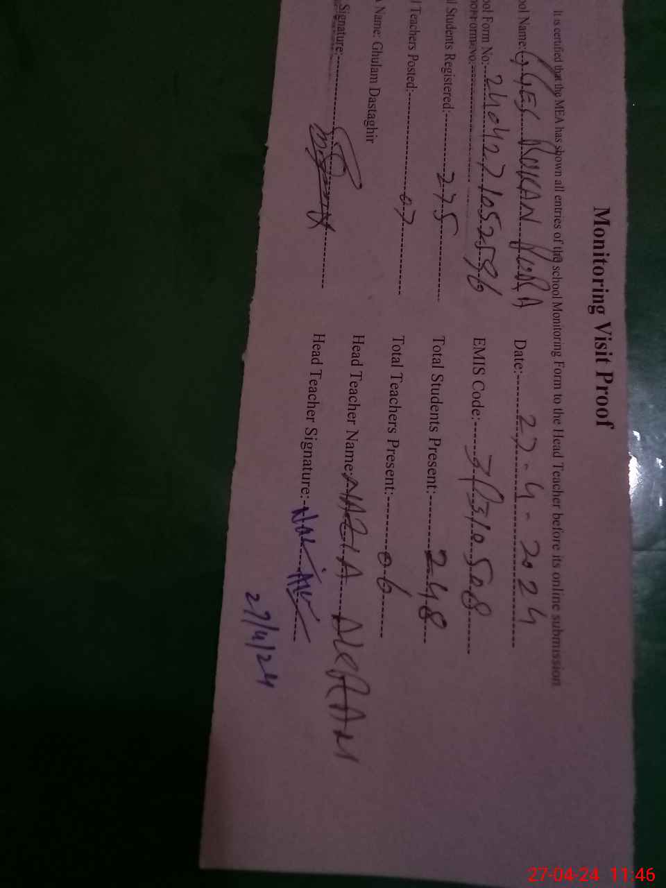 | Attendance Register | Head Teacher | MEA with School | Visit Proof |