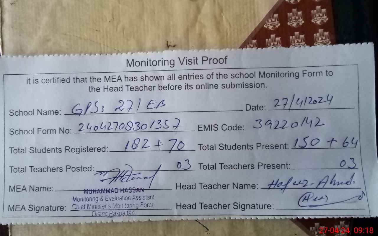 | EMIS Code: 39220142 | Name of School: GPS CHAK NO. 27 EB | |||