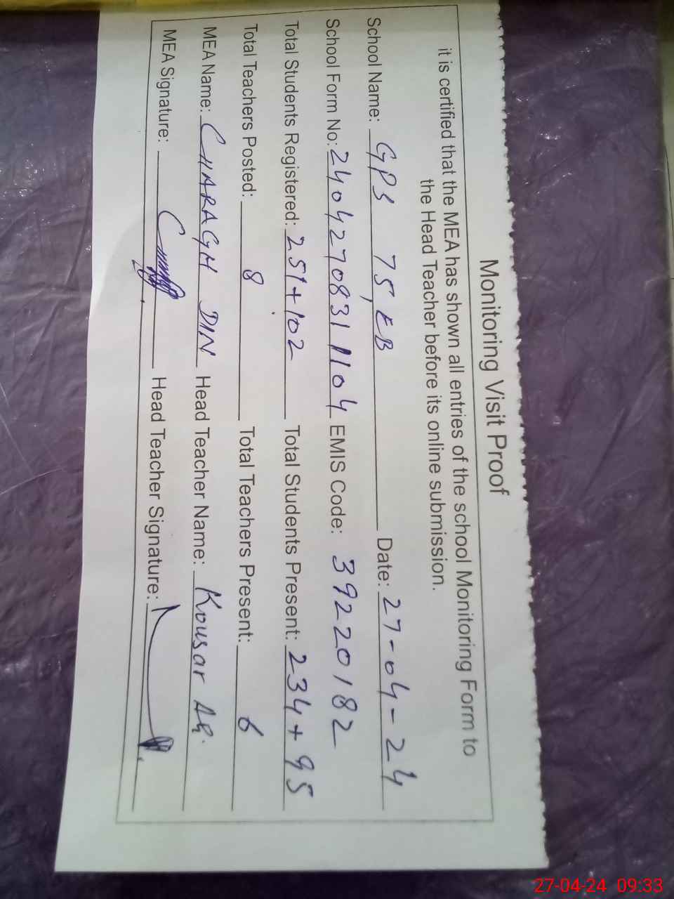 | Attendance Register | Head Teacher | MEA with School | Visit Proof |