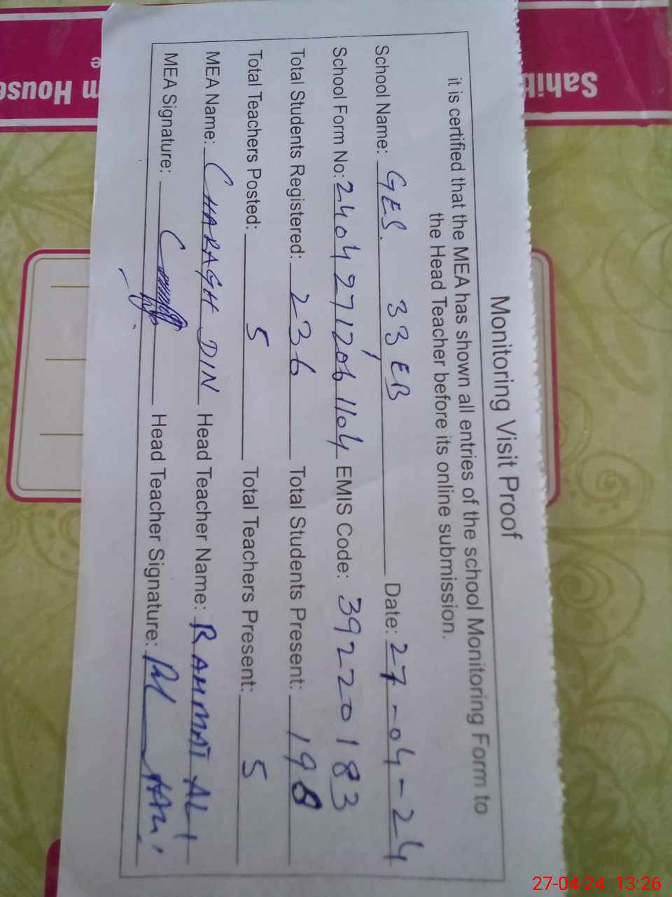 | Attendance Register | Head Teacher | MEA with School | Visit Proof |