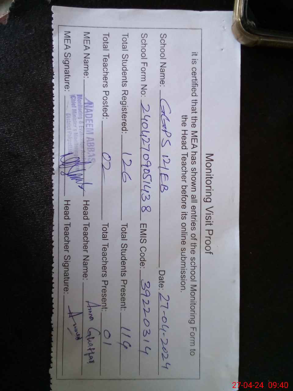 | Attendance Register | Head Teacher | MEA with School | Visit Proof |