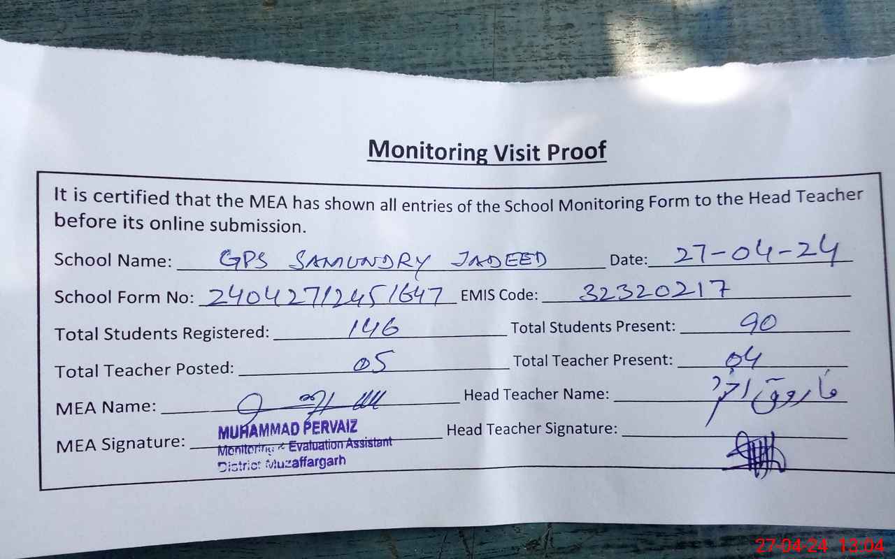 | EMIS Code: 32320217 | Name of School: GPS SAMUNDARY JADEED | |||